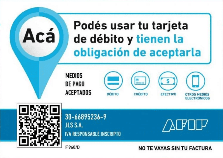 Deberá ubicarse en un lugar visible y destacado próximo a aquel en el que se realice el pago de la operación respectiva, de manera tal que permita a los ciudadanos y agentes de AFIP, mediante el uso de un dispositivo móvil provisto de lector de código “QR” y con conexión a “Internet” – ubicado a una distancia máxima de un metro para proceder a la lectura del citado código- acceder a los datos que, a título enunciativo, se consignan en el micrositio (http://www.afip.gob.ar/960).
